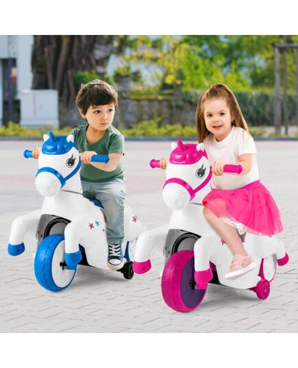 -Dual 6V 4.5AH batteries and dual motors support long-time driving-Dual driving modes enable kids to enjoy the normal driving and horse riding-Equipped with safe training wheels to promote the stability and using safety-Effortless operation with forward/backward button and one-button start-Provides the music function that keeps children entertained-Reliable wheels are anti-slip and wear-proof improving the driving experience-Stable driving on various roads such as asphalt floor tile floor carpet etc-Easy charging is ensured by the included charger and charging port-Comfortable handle and spacious seat enhance the sitting comfort-Foot pedal is combined with thoughtful footrests to accommodate kid's feet-The cute unicorn design is attractive making it a perfect gift for kids-Thanks to the LED power display accidents of power shortage can be avoided-Premium ride on car is ASTM compliant and CPSIA certificatedâ— 2 Driving Modes for More Fun - Seamlessly switch between a smooth drive and an exciting horse riding mode that mimics up and down galloping action all at the push of a switch button. The 12V ride on car provides a safe speed of 1.86 MPH.â— Easy Operation for Convenience - The ride on horse boasts a one-button start a foot pedal and an intuitive direction button for effortless driving. Besides the toy car has a music button that adds a soundtrack to your child's adventures.â— Stable and Safe Driving Experience - Give your child the confidence to explore with the motorized toy car featuring reliable wheels that ensure stability on various surfaces. Enhanced with training wheels this car perfectly maintains balance and safety.â— Powerful Toy Car - The ASTM compliant and CPSIA certificated ride on pony boasts 2 6V 4.5AH batteries and 2 motors for consistent performance. The LED power display prevents power shortages by keeping you informed about the battery status.â— Perfect Gift for Your Kids - To delight kids the play horse boasts a charming unicorn theme ideal for sparking magical adventures. Designed for great comfort it features easy-to-grip handles and a wide seat. It will be a perfect gift for kids aged 3 and above. Color Rose Red and White/Blue and White/Pink and White Material PP TPR Overall Dimensions 27" x 15" x 22.5" Size of Seat 8" x 5.5" Height of Seat 11" Load Capacity of Seat 66 lbs Suitable Age Over 3 Years Old Battery 2 x 6V 4.5AH Charger 12V 500MA Speed 1.86 MPH Net Weight 14 lbs