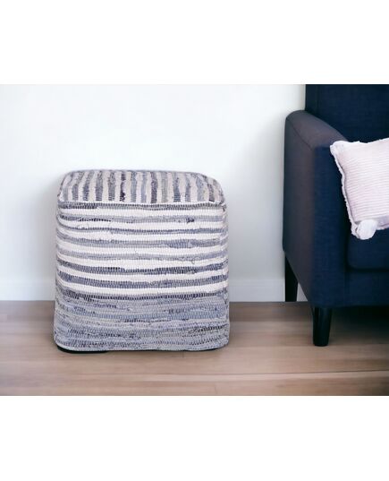 18" Blue Cotton Cube Striped Pouf Ottoman