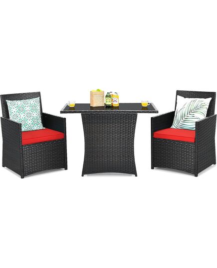 Start your comfortable outdoor life from this 3 pcs patio dining set! With curved backrests, comfy armrests and soft cushions, this 3-Piece Patio Furniture Outdoor Dining Set in Brown PE Rattan with Red Cushions provides optimal comfort for outdoor relaxation. Considering the changeable weather, this patio dining set is constructed of anti-rust steel frame and all weather PE rattan. If you accidentally spill a drink on the table or cushions, don't worry. The smooth tabletop with durable tempered glass is easy to clean. And the cushion covers with zipper design can be detachable for easy maintenance. After using it, you are able to store 2 chairs under the table to save your outdoor space. 3-Piece Patio Furniture Outdoor Dining Set in Brown PE Rattan with Red Cushions Pushes 2 chairs within the table for space-saving Puts your feet cozily thanks to its spacious space under the table Ideal for limited space with compact design Fits your body curve thanks to its ergonomic backrest and armrests Thick and soft cushion for ultimate comfort and relaxation Detachable and washable cushion cover for great convenience Smooth tempered glass tabletop for easy maintenance Sturdy and anti-rust steel frame for strong loading capacity Weather-resistant PE rattan for long time use Ensures extra stability with anti-slip foot pads Suitable for patio, porch, garden and balcony, etc Easy to assemble with detailed instruction Color of rattan - Mixed brown/Mixed Gray Color of cushion - Gray/Navy/Red/Turquoise/White Material - Steel, PE rattan, sponge, tempered glass, polyester fabric Package includes - 1 x Table, 2 x Chairs Space-saving Design - Compared with other common bistro sets, this outdoor conversation set will save your space when not using it. In other words, if you finish your outdoor activities, just push 2 chairs under the table for space-saving. Hence, this compact design matches the limited space. And when you sit, there is a spacious space under the table for your feet. Built for Comfort - The 2 ergonomic chairs are designed with slightly curved backrests, ergonomic armrest and breathable cushions, which will offer comfortable sitting experience to relieve your body fatigue. Besides, the covers of cushions (pillows in the picture are not included) are removable for easy cleaning. Selected Materials - Made of rustproof steel frame wrapped with weather-resistant PE rattan, this patio bistro set allows you to leave it outside. Meanwhile, tempered glass is studier and safer than other common glasses. And, both table and chairs have non-slip foot pads for additional stability. Wide Application - Combining practicality and aesthetics as one, this modern patio conversation set makes a great addition to your outdoors. Therefore, you can place it in different places based on your preference, such as garden, porch, backyard, balcony and poolside, etc. Product Information - Dimension of each chair - 26” x 22” x 34” (L x W x H), dimension of table - 41” x 25” x 28” (L x W x H), seat height from the ground - 16.5”, weight capacity of each chair - 350 lbs, weight capacity of table - 110 lbs. Product Care Instructions - Wipe with Dry Cloth Material - Glass,Rattan Dimensions - Table - 41” x 25” x 28” (L x W x H) Dimension of each chair - 26” x 22” x 34” (L x W x H) Dimension of cushion - 20” x 20” x 2.4” (L x W x Thickness) Seat height from the ground - 16.5” Net weight of table - 26.5lbs. Net weight of each chair - 15lbs. Weight capacity of table - 110lbs. Weight capacity of each chair - 350lbs. Weight - 57lbs.