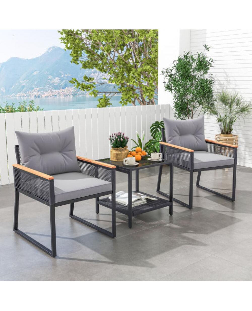 3 Pieces Patio Furniture Set with 2 Tier Coffee Table and Soft Seat Cushions-Gray