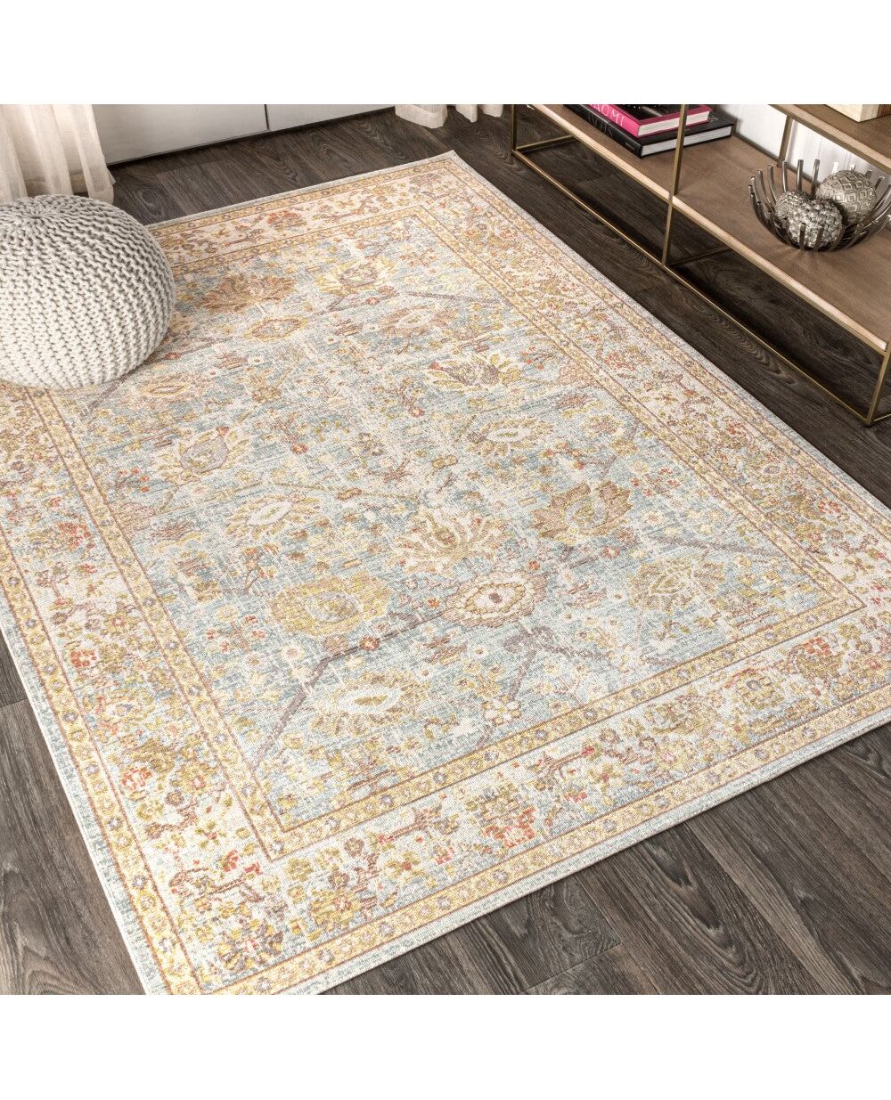 Inspired by antique Peshawar rug designs, this classic pattern has been updated with a modern, distressed-gray color palette. A center field of stylized flowers is framed by a floral border. This updated design is the perfect complement to a modern living room, bedroom or dining room.