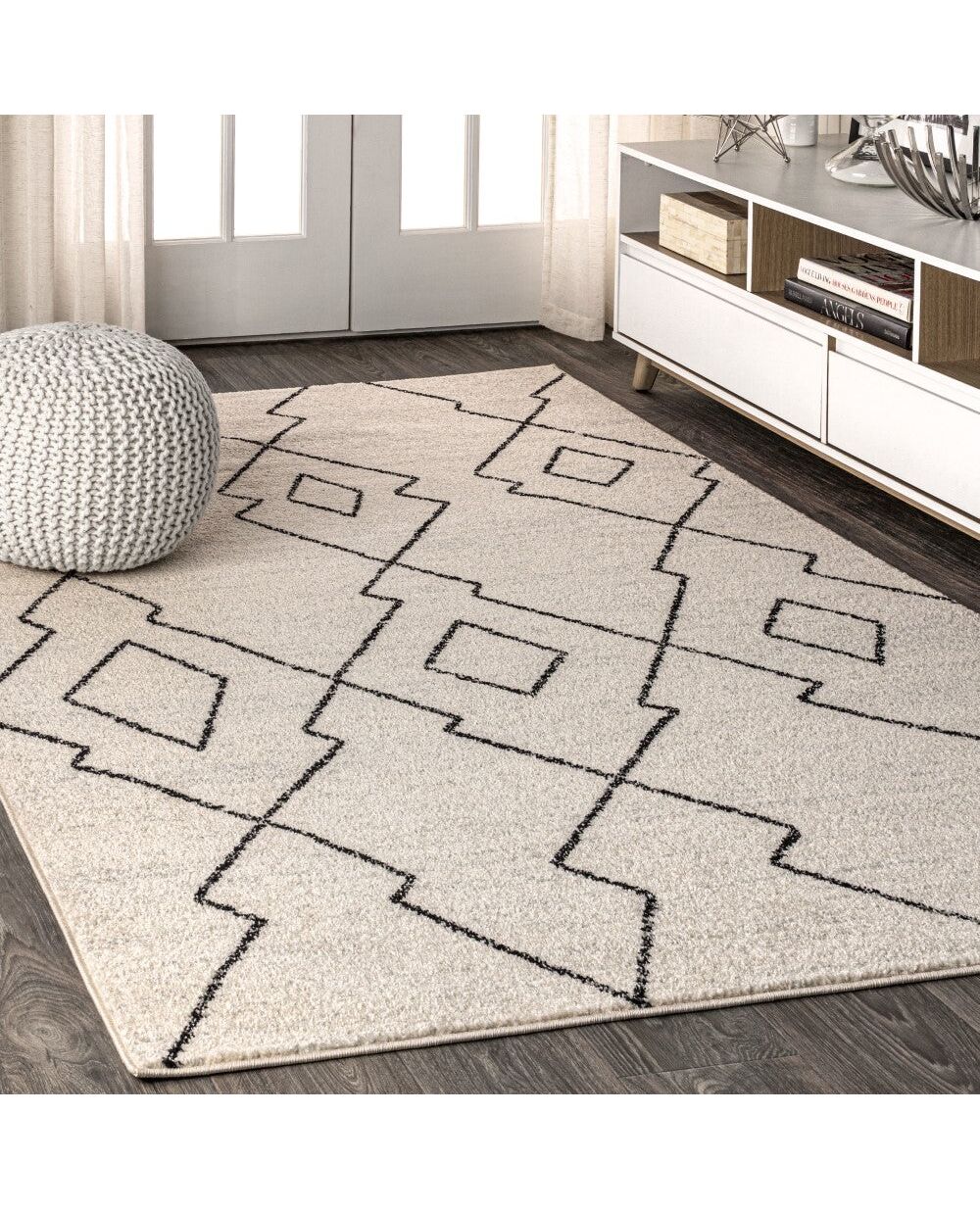 Inspired by vintage Beni Ourain Moroccan rugs, our modern version is power-loomed with a short pile. Diamonds and geometric forms are woven in black against a field of ivory; tassel fringes at each end are braided in traditional style. Add some Bohemian style to your home with this easy-care rug.