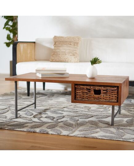 Give your living room a touch of rustic warmth with this Allester Coffee Table. Designed with an artistic, asymmetrical wood frame in a rich brown tone, Allester features one stylish rattan drawer ideal for stowing books, magazines, or remotes.