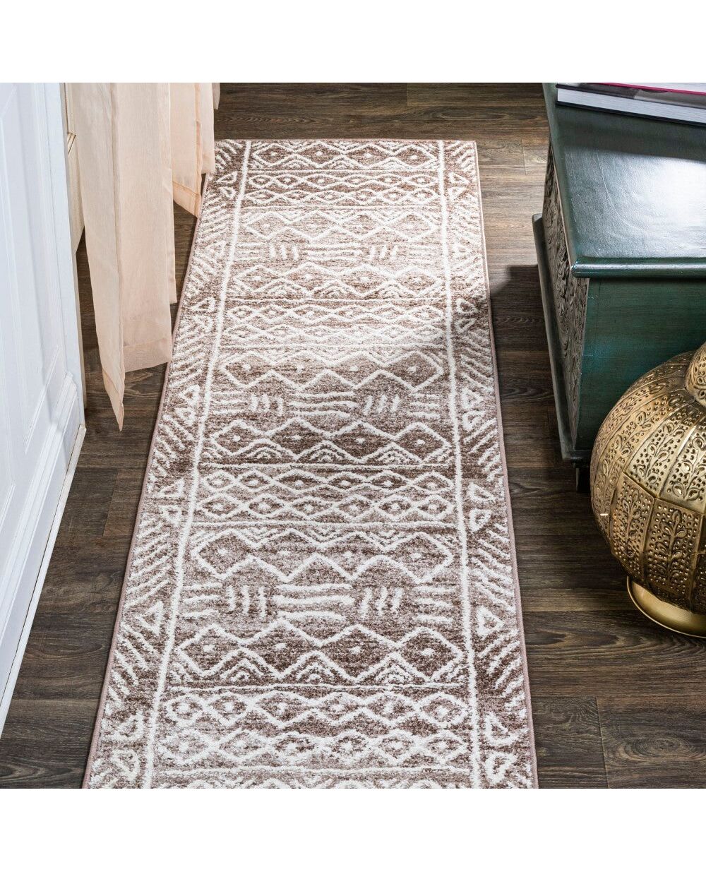 Inspired by vintage Moroccan rugs, our easy-care rug has a family-friendly short pile. The neutral brown and beige pattern features geometric tribal designs with a graphic border. Anchor your modern Bohemian space; add minimalist flair to a bedroom, living room, dining room, kitchen or entry; this is a durable rug with timeless style.