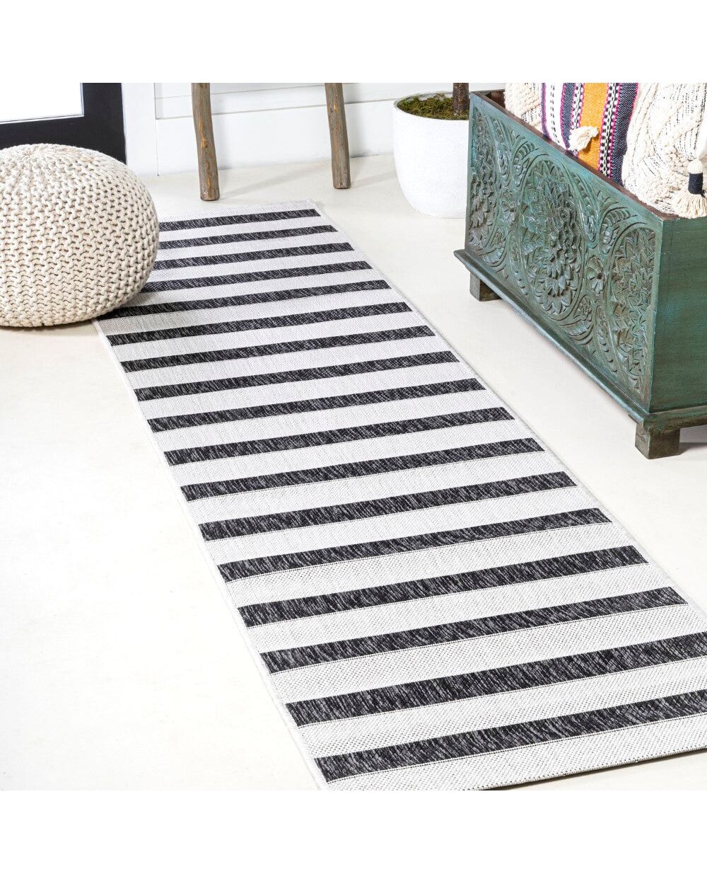 A simple wide stripe is woven with a mingled effect to create a classic neutral rug. This versatile rug is perfect for your tropical cottage porch or modern outdoor patio. The traditional stripe is a family-friendly solution for a casual living room, modern bedroom, kitchen hallway, entry or kids bedroom. The pet-friendly and kid-proof flatweave design makes it easy to clean, and perfect for the beach house.