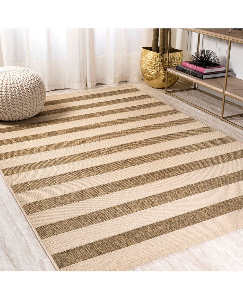 A simple wide stripe is woven with a mingled effect to create a classic neutral rug. This versatile rug is perfect for your tropical cottage porch or modern outdoor patio. The traditional stripe is a family-friendly solution for a casual living room, modern bedroom, kitchen hallway, entry or kids bedroom. The pet-friendly and kid-proof flatweave design makes it easy to clean, and perfect for the beach house.