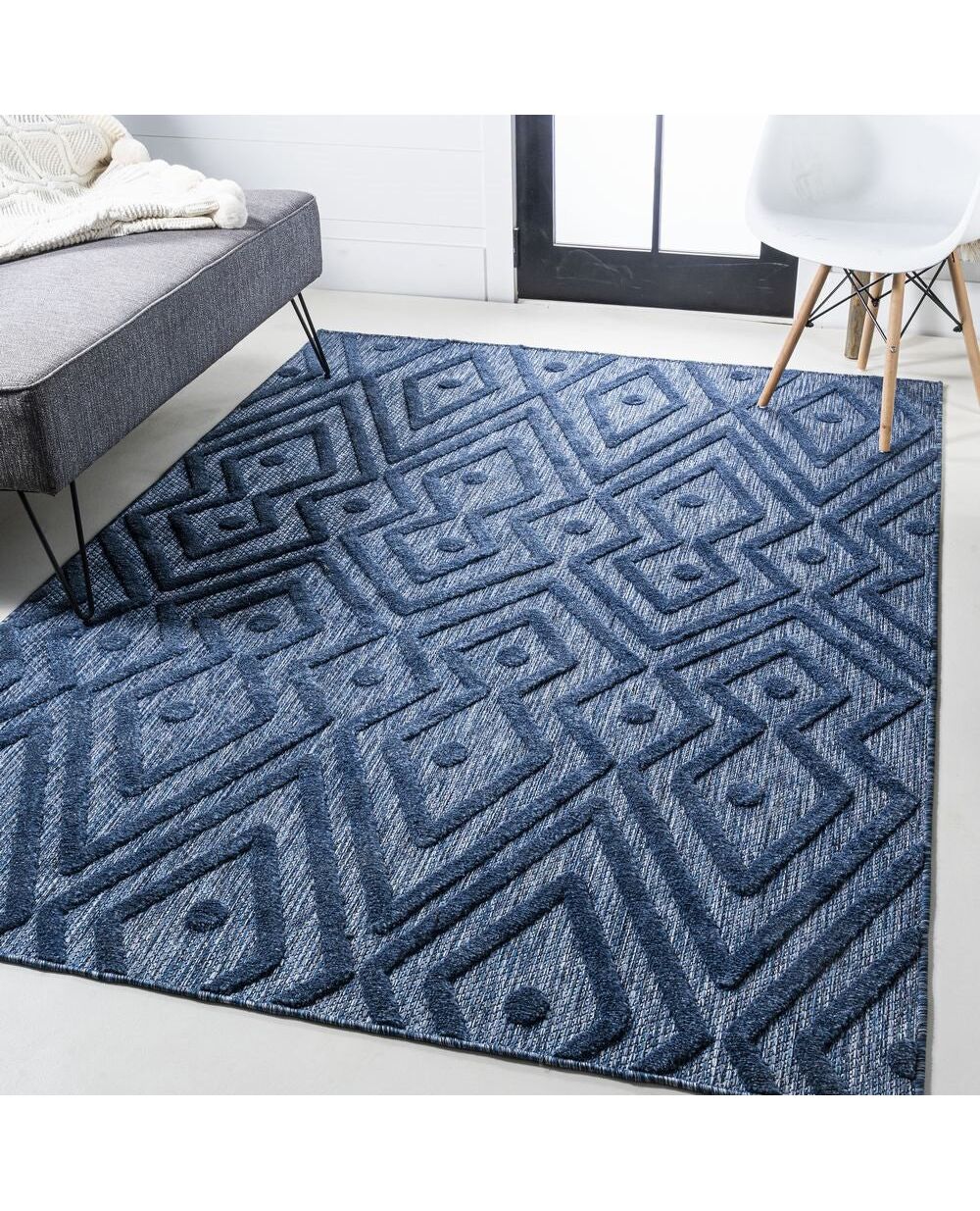 Inspired by vintage Moroccan rugs, our indoor/outdoor rug adds modern tribal style to your porch, patio or sunroom. The classic Moroccan pattern has a geometric design of navy diamonds, dots and zigzags. Mingled threads give this rug a handwoven, vintage vibe that's perfect for an entry, kitchen, hallway, living room or bedroom too. The pet-friendly and kid-proof flatweave design makes it easy to clean, and perfect for the beach house.