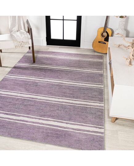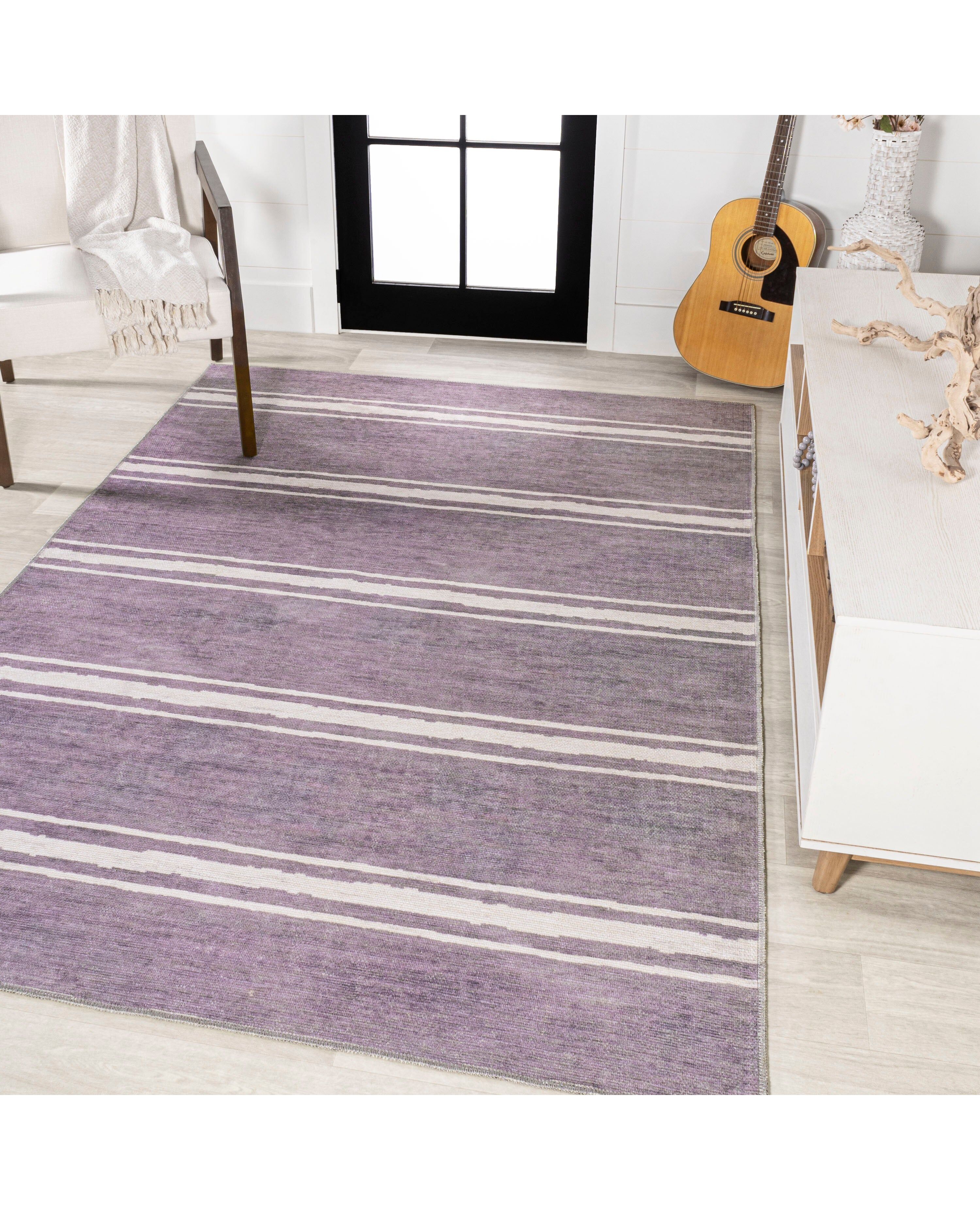 Bande Distressed Ticking Stripe Machine-Washable Lavender/Ivory Area Rug