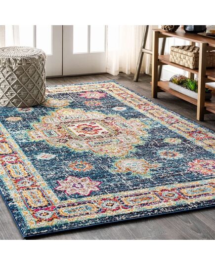 Whimsical in color, the traditional framed medallion design on this bohemian rug adds a tasteful splash of color to any style of décor. Whether for a high traffic space like a living room or dining room, or a private space like a bedroom or bathroom, the durability and style combine to create the perfect floor covering. In shades of navy, red, aqua, and ivory; this rug is a stunning accent for any space.