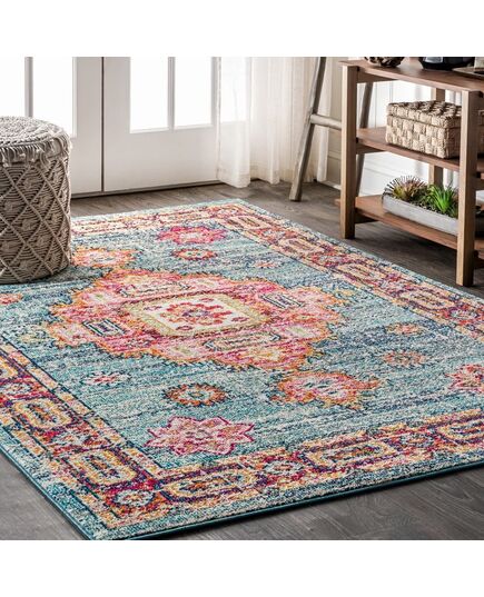 Whimsical in color, the traditional framed medallion design on this bohemian rug adds a tasteful splash of color to any style of décor. Whether for a high traffic space like a living room or dining room, or a private space like a bedroom or bathroom, the durability and style combine to create the perfect floor covering. In shades of navy, red, aqua, and ivory; this rug is a stunning accent for any space.