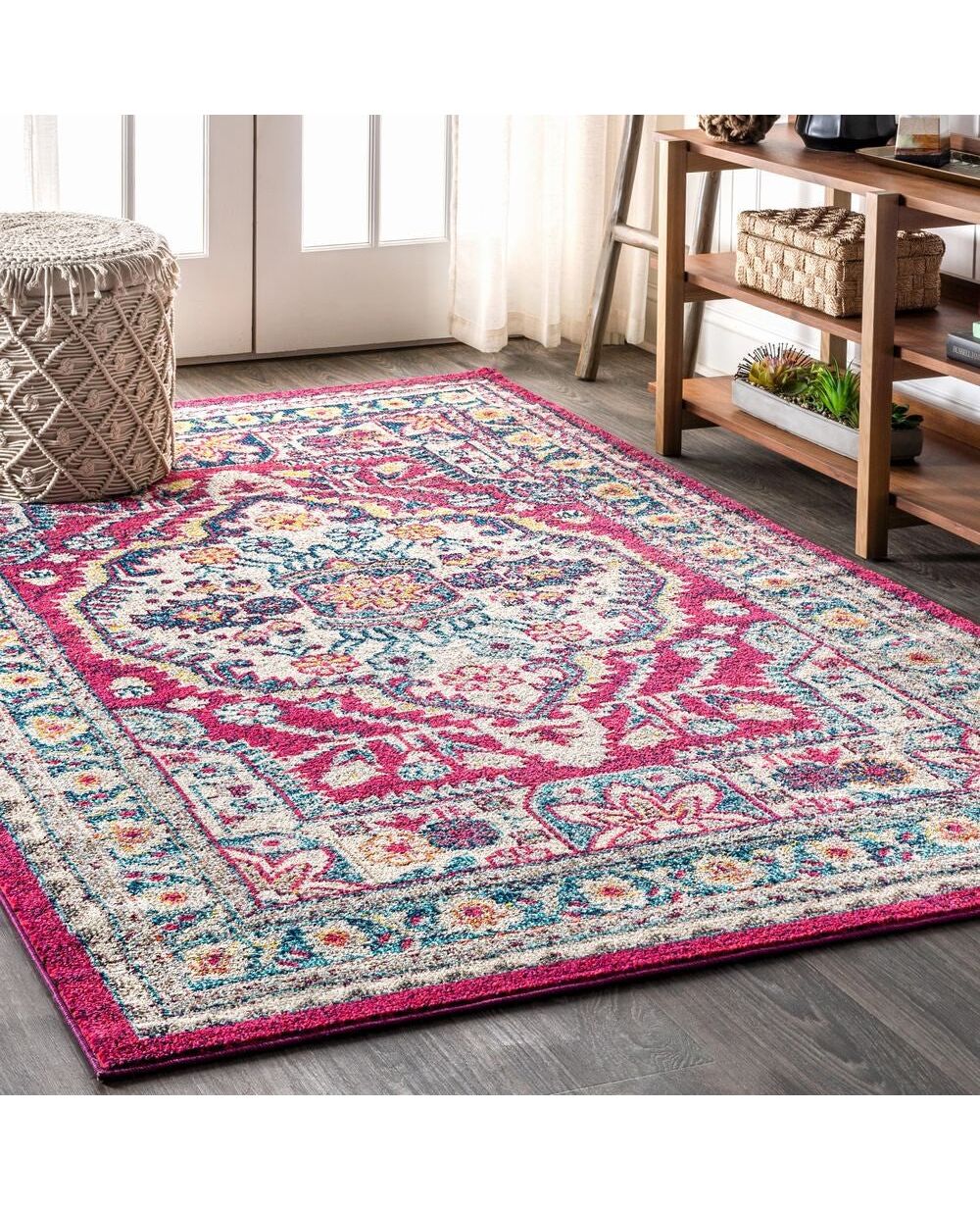 Old world style gets new life in a stunning fuchsia pink color in this bohemian rug inspired by the oriental masterpieces of antiquity. A large center medallion and thin border create an optical illusion that will make your space feel larger, all while creating a stunning accent for eclectic or modern decor. With only a 1/3" pile, it is durable enough for high traffic areas like a living room or foyer, but soft enough for bedrooms as well.