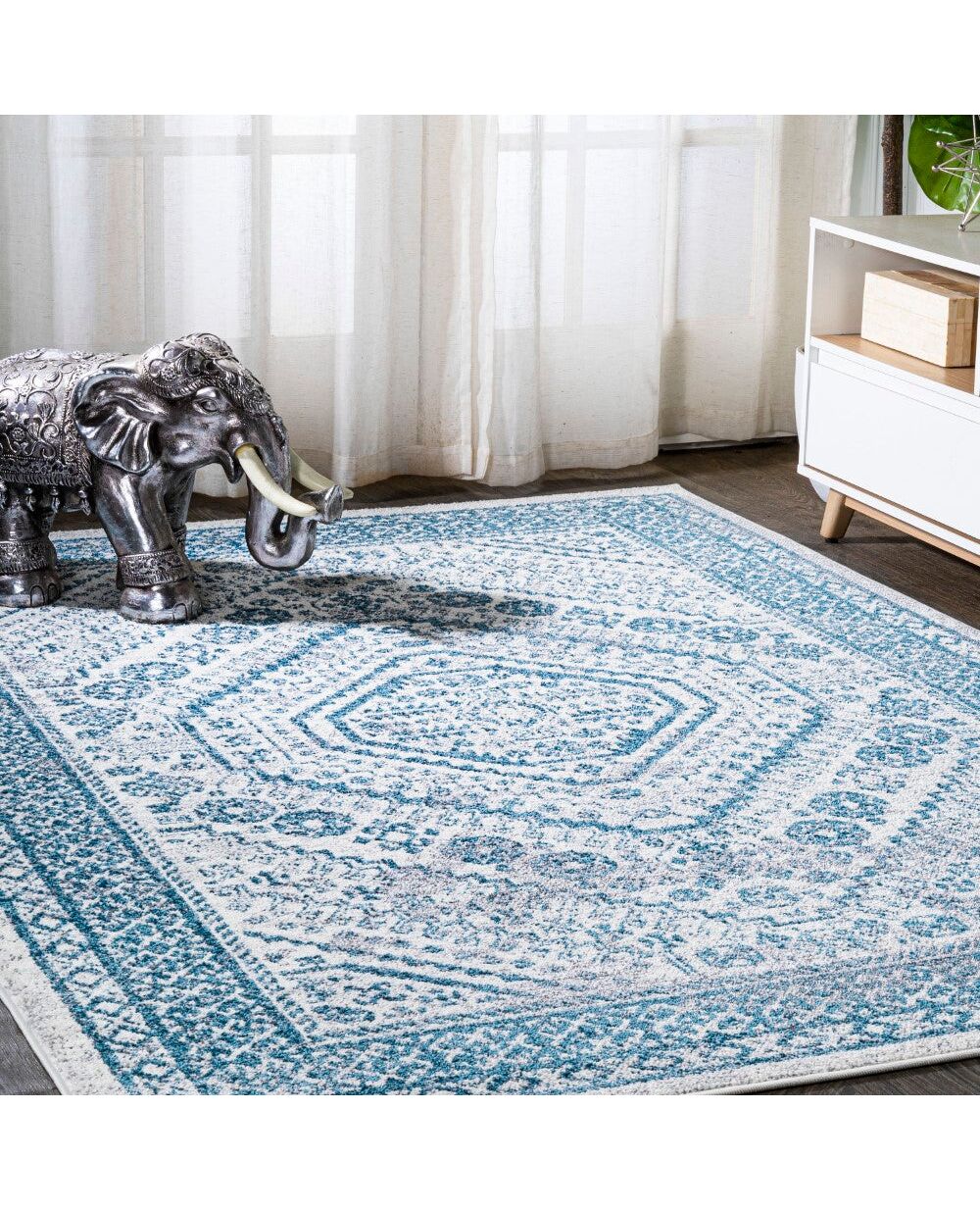 This ornate medallion rug has a geometric pattern that adds modern Bohemian style to a living room, bedroom, entry or kitchen. Varied tones of turquoise mingled with a gray and ivory background give this rug a hand-woven, vintage vibe. The busy allover pattern is pet-friendly and great for kids too.