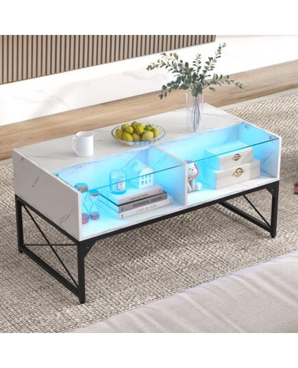 -Built-in LED Lights create the perfect ambience according to your mood-Designed with 20 static colors 22 dynamic modes 10-level adjustable speed and 5-level adjustable brightness-High-gloss faux marble surface adds a luxurious appeal-High-strength tempered glass is waterproof and easy-to-clean-Ample storage space for decorations magazines tissues laptop snacks or cups-Protective suction pads keep the glass top in place-Metal frame with reinforced structure ensures better stability and durability-Adjustable foot pads prevent wobblingâ— Customizable LED Lighting - The center table with LED light can create a variety of ambiances controlled effortlessly via a remote control. Set the mood by adjusting the color mode speed and brightness of the light!â— Stylish Split Top Design - The LED coffee table boasts a stylish tabletop with a unique combination of faux marble and tempered glass offering a blend of elegance and durability. The high-gloss finish adds a touch of sophistication.â— Functional Storage - The high-gloss accent table includes 4 storage cubes providing ample space for organizing and storing items. Together with the spacious tabletop the table offers easy access to living room essentials.â— Sturdy Construction - The rectangle coffee table features raised support legs leaving enough space underneath for floor cleaning. Additionally the reinforced metal frame boasts excellent stability and a modern look.â— Versatile Use - Combining style and function this faux marble coffee table can serve as a centerpiece in living rooms entertainment areas or even as a focal point in a lobby or lounge. Color White/Black Material Engineered Wood Metal Tempered Glass Overall Dimensions 41.5" x 21.5" x 19.5" Dimensions of Glass Top Cube 19.5" x 11" x 7" Dimensions of Faux Marble Top Cube 19.5" x 10" x 7" Raised Height from Ground 10.5" Weight Capacity in Total 440 lbs Weight Limit of Glass Top 66 lbs Net Weight 45 lbs