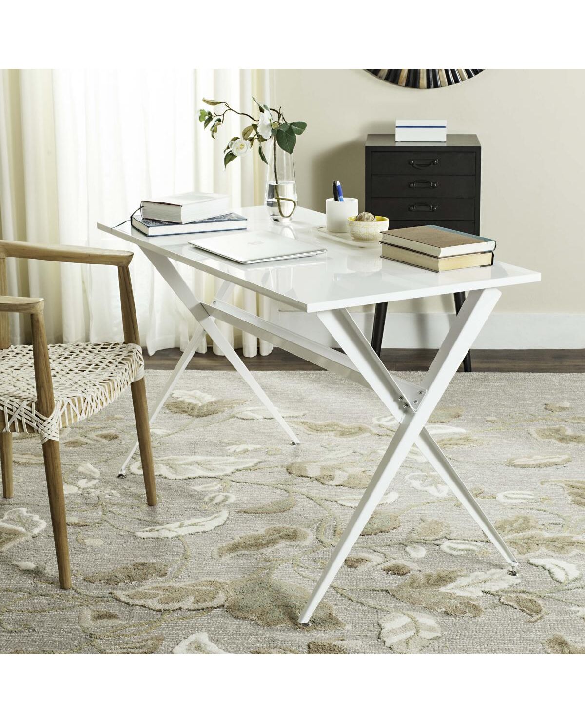 The light and airy silhouette of the red Chapman desk is a modern update of classic picnic and refectory tables. Its top appears to float on chic tapered crossed legs, and this sophisticated desk is finished in a sleek lacquer look finish. Full Dimensions - 47.2" x 23.6" x 29.1" Weight Capacity - 55lb