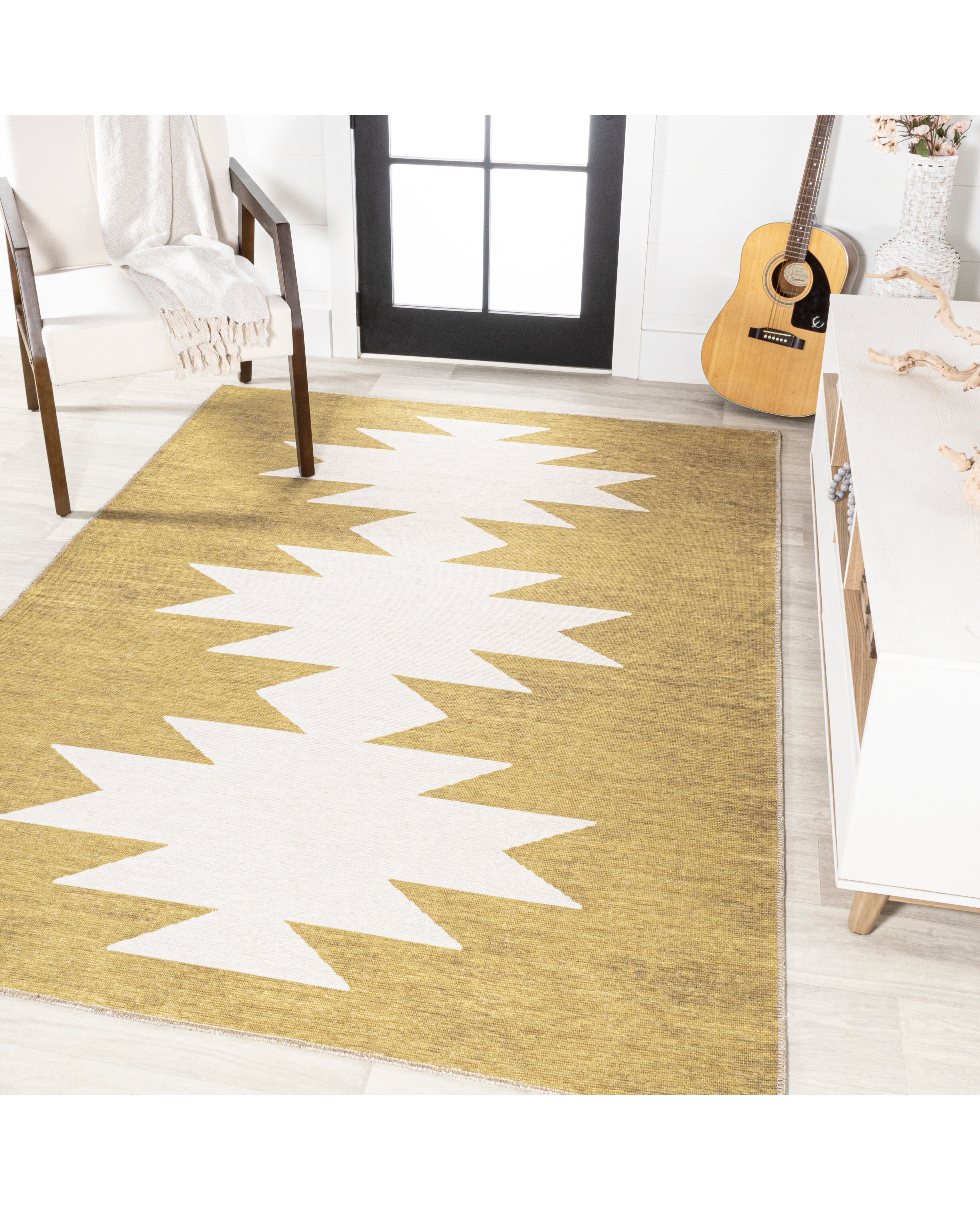 Inspired by Native American tribal rugs, our machine washable geometric rug has minimalist simplicity. The triple medallion pattern is woven in a modern, two-tone color palette. Add graphic punch to your living room, dining room, entry, or bedroom with this easy-care rug.