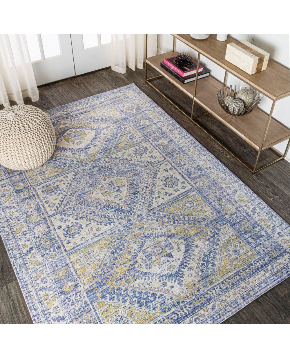 Three diamond-shaped medallions in the center of this design recall Moroccan tribal rugs. The faded indigo-blue color scheme adds a modern touch. With its Bohemian-inspired, distressed look, this denim-inspired rug would be perfect for a dining room, living room, entry or bedroom.