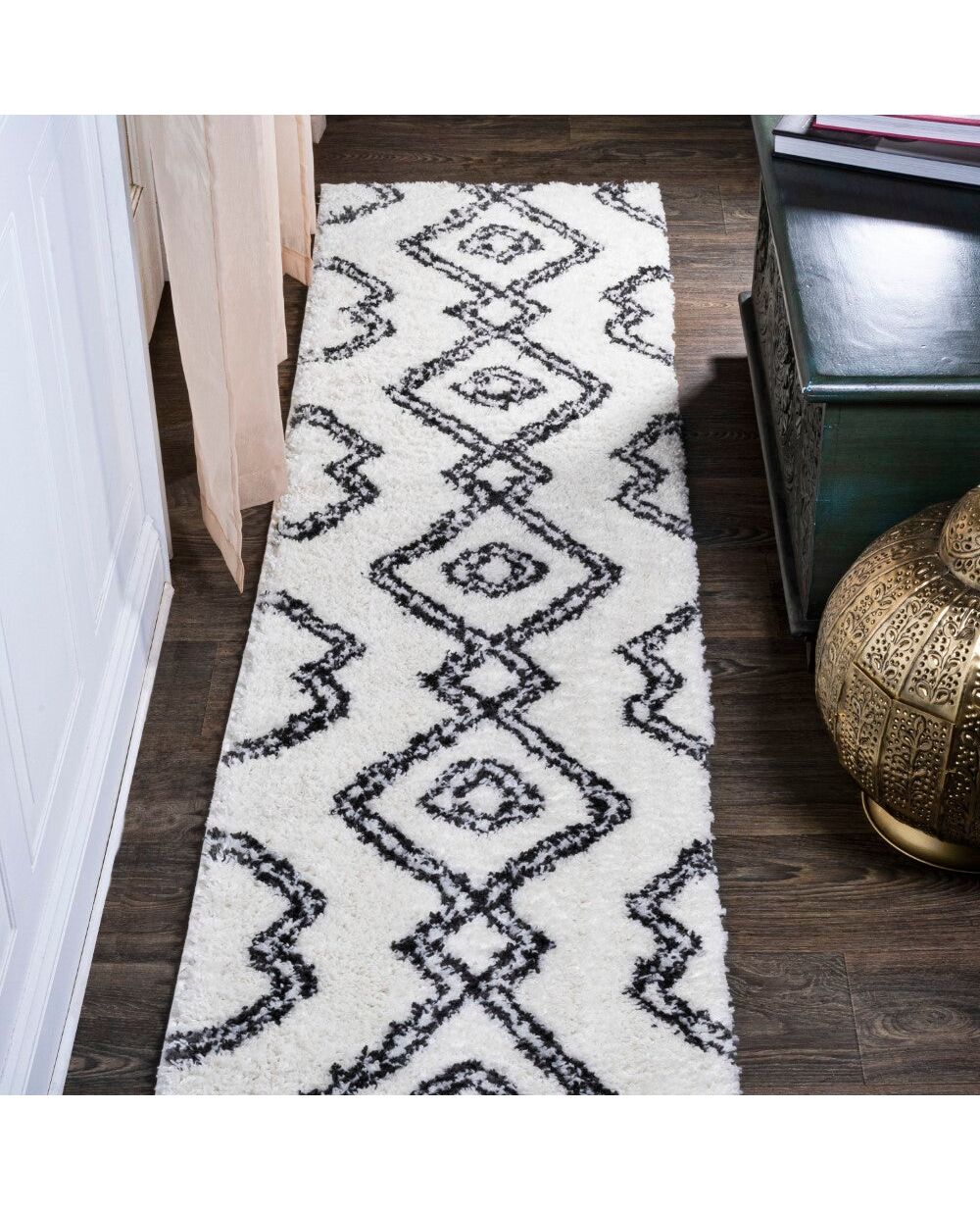 Inspired by vintage Beni Ourain Moroccan rugs, our soft and fluffy shag yarns make it easy to go barefoot. The classic Moroccan pattern has a geometric design of deep black diamonds on a field of ivory. Anchor your Bohemian space; add softness to a bedroom, living room, or cozy reading nook; this is a low-pile shag rug with timeless style.