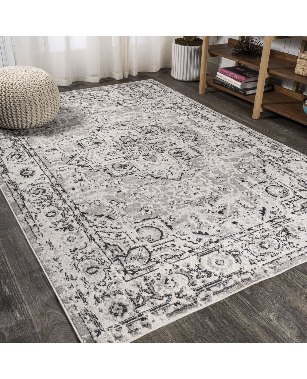 This ornate medallion rug has a geometric pattern that adds modern Bohemian style to a living room, bedroom, entry or kitchen. Varied tones of gray mingled with an ivory background give this rug a hand-woven, vintage vibe. The busy allover pattern is pet-friendly and great for kids too.