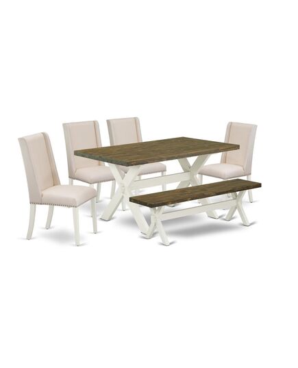 East West Furniture 6-Piece Gorgeous Dining Room Table Set a Good Distressed Jacobean Dining Table Top and Distressed Jacobean Wooden Bench and 4 Beautiful Linen Fabric Parson Dining Room Chairs with