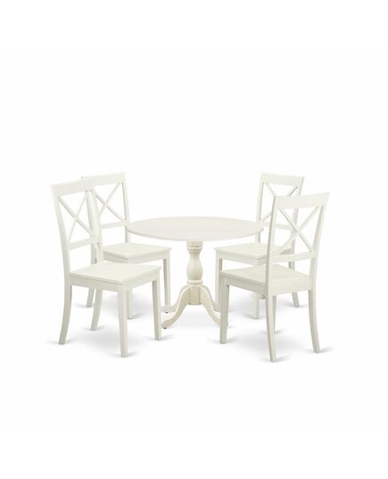 East West Furniture DMBO5-LWH-W 5 Piece Wood Dining Table Set Consists of 1 Drop Leaves Dining Table and 4 Linen White Wooden Kitchen Chairs with X-Back - Linen White Finish