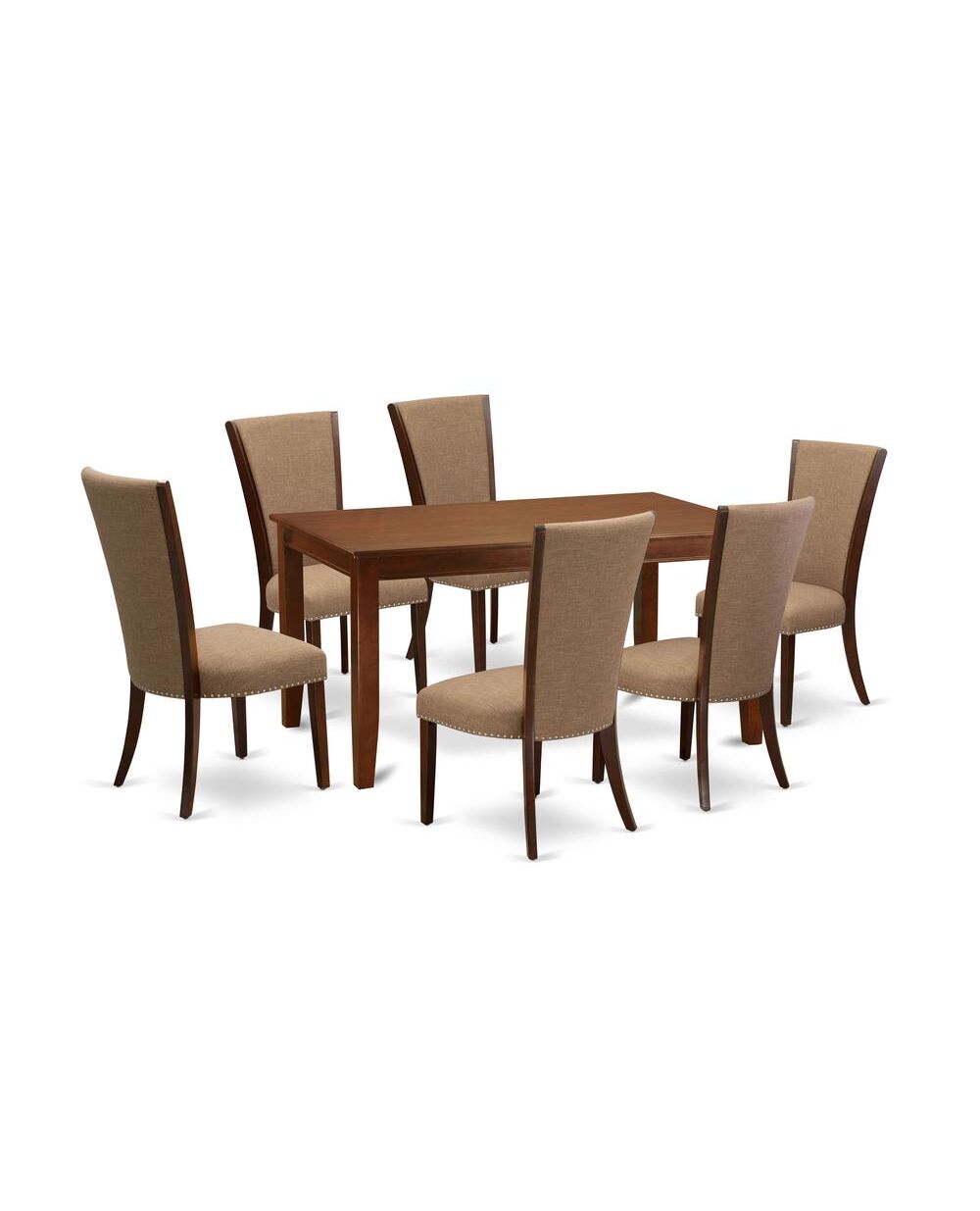 East-West Furniture DUVE7-MAH-47 - A dining room table set of 6 wonderful dining room chairs with Linen Fabric Light Sable color and a gorgeous dinner table in Mahogany Finish