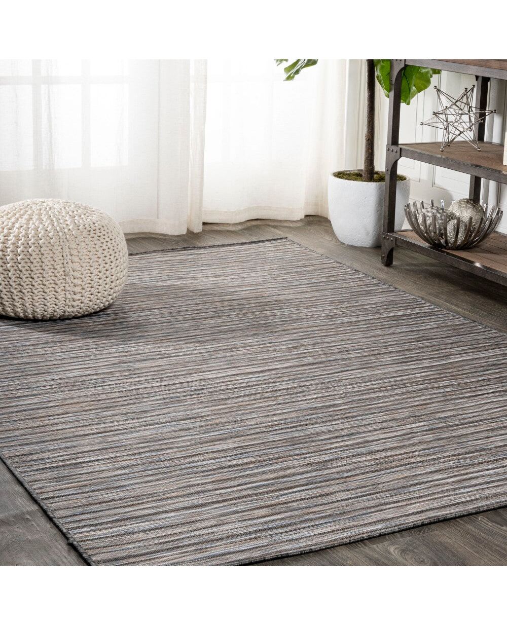 Anchor your mid-century modern, urban contemporary, or farmhouse-inspired space with our flat-weave striped rug. The mingled dark gray stripe design is practical for high-traffic areas with kids and pets. Add pattern to a living room, dining room, entry, office or bedroom with this easy-care synthetic rug.