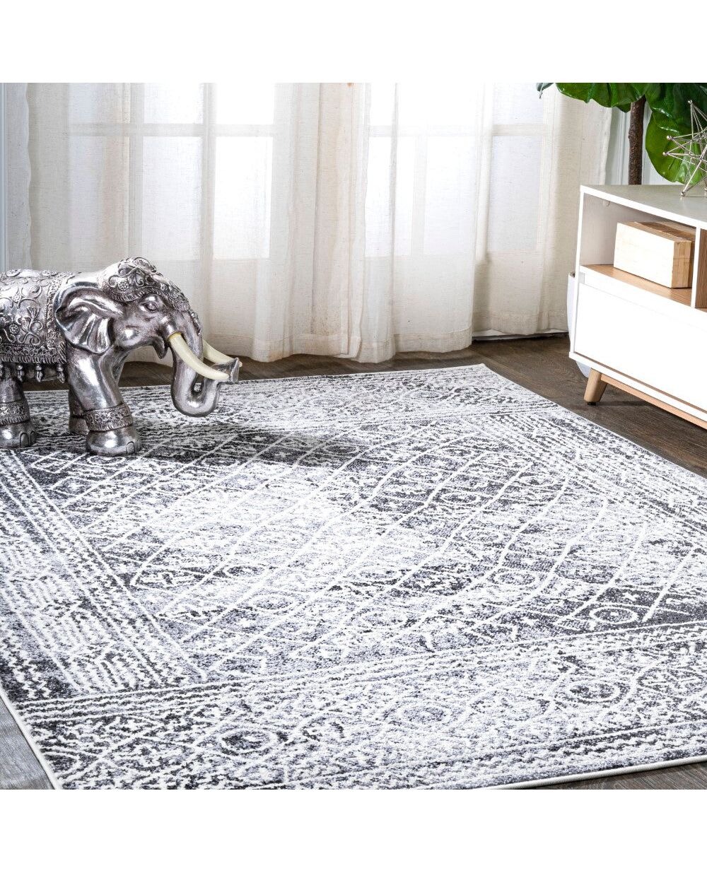 Inspired by vintage Moroccan rugs, our easy-care rug has a family-friendly short pile. The classic black and ivory pattern features geometric diamonds with a graphic border. Anchor your modern space; add minimalist flair to a bedroom, living room, dining room, kitchen or entry; this is a durable rug with timeless style.