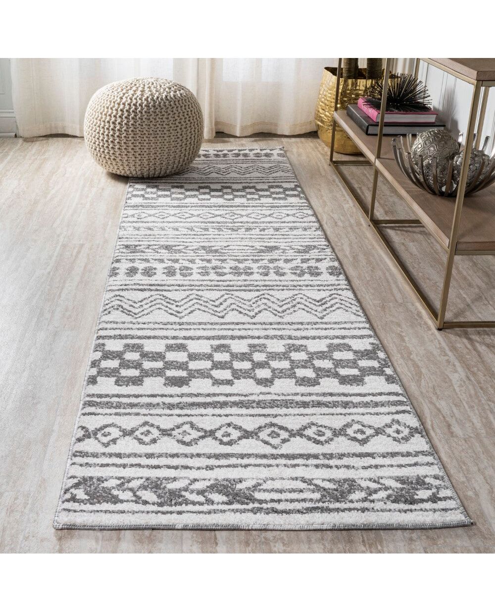 Inspired by Moroccan and tribal designs, our modern stripe pattern is ideal for a living room, bedroom or entry. Tribal-inspired geometric symbols are woven in ivory and gray; the mingled threads recall vintage handwoven rugs. Add contemporary Bohemian style to your home with this easy-care rug.