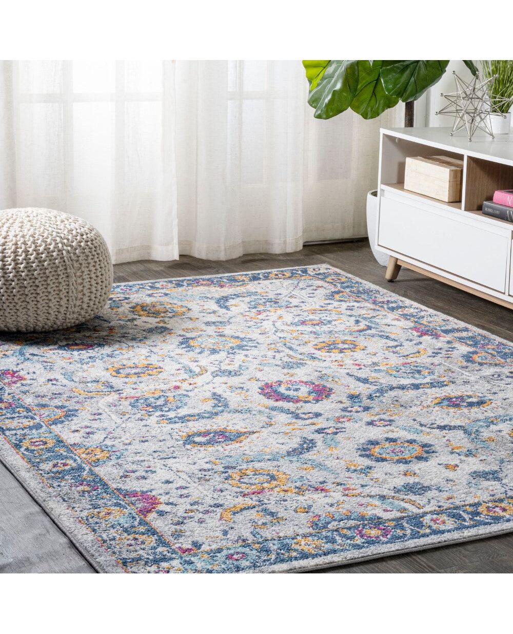 Layer on the cottage style with this colorful rug's traditional Persian design. The family-friendly pattern mixes rich jewel tones with golden yellow, on a distressed gray background for a vintage vibe. It's the perfect start to a rich color scheme in a bedroom, living room, entry, or dining area.