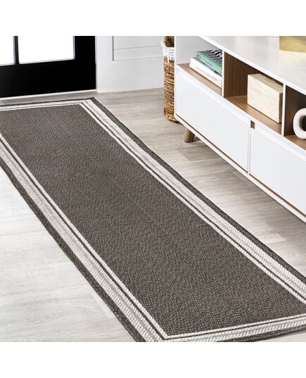 Inspired by the clean lines of modern design, our stripe border rug has a durable low pile. This versatile pattern is woven in contrasting colors for a low-key, minimalist look. Add graphic punch to your living room, dining room, bedroom, or porch with this easy-care, family-friendly rug.