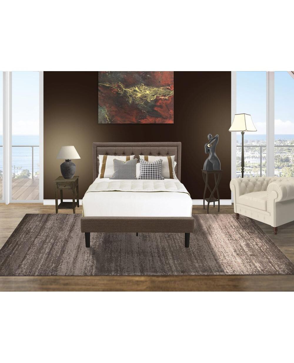 KD18F-1DE07 2 Pc Full Size Bed Set - Platform Bed Brown Headboard with 1 Wood Night Stand - Black Finish Legs