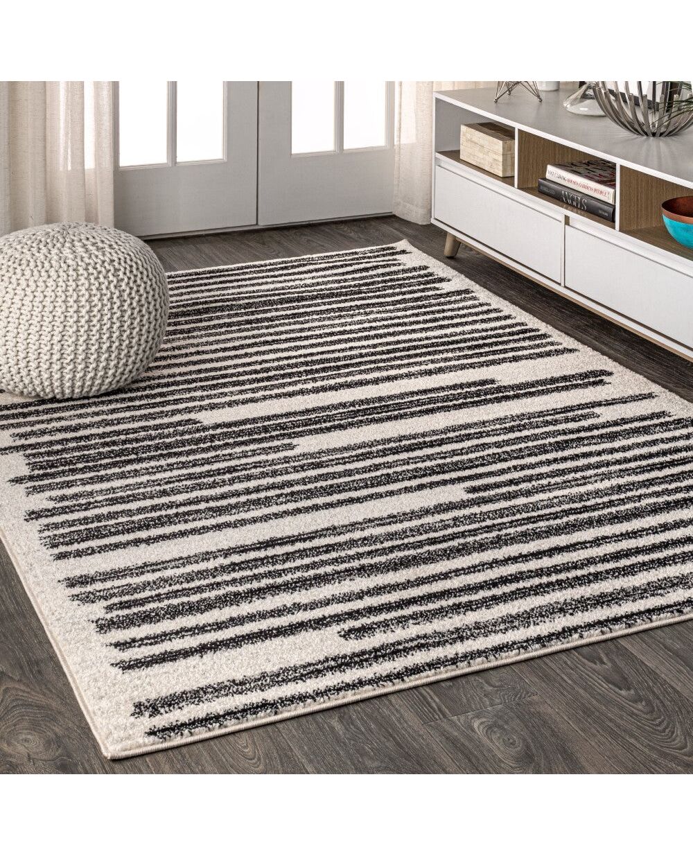 Inspired by vintage Moroccan rugs, our modern striped rug is power-loomed with a short pile. The offset stripe and bar pattern is woven in black on an ivory background; the mingled threads recall traditional handwoven rugs. Add some mid-century style to your home with this easy-care rug.