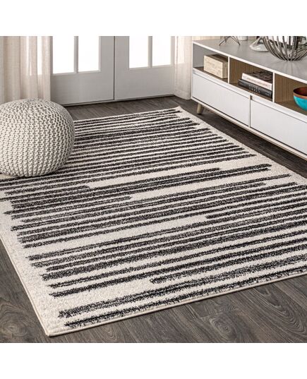 Inspired by vintage Moroccan rugs, our modern striped rug is power-loomed with a short pile. The offset stripe and bar pattern is woven in black on an ivory background; the mingled threads recall traditional handwoven rugs. Add some mid-century style to your home with this easy-care rug.