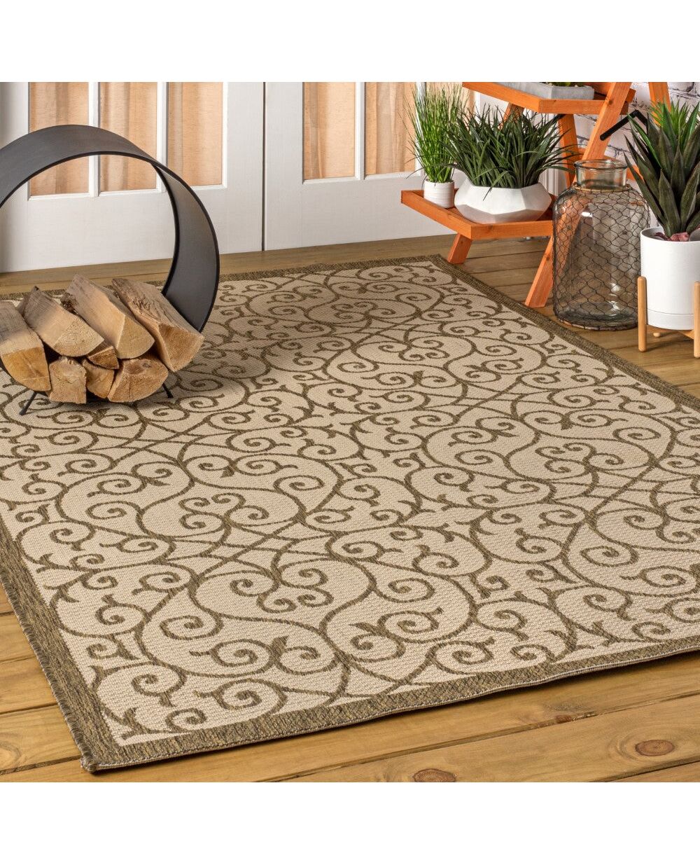 With its filigree design inspired by Spanish wrought iron, our Boho-chic rug adds eclectic style to an outdoor porch or patio. Varied tones of taupe and ivory mingled with an espresso brown pattern give this rug a hand-woven, vintage vibe. The flatweave design is great for high-traffic spaces indoors too.