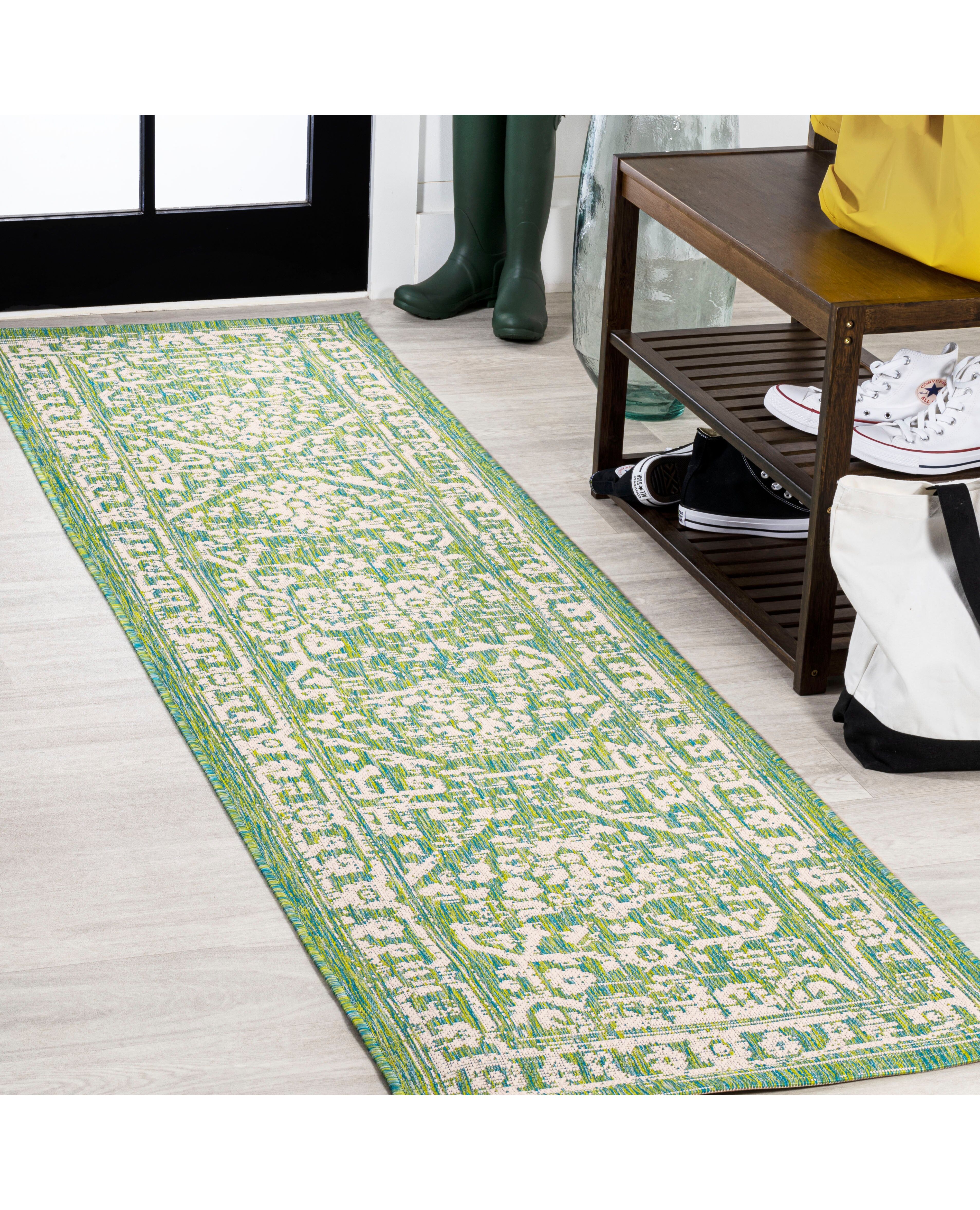 This colorful medallion rug adds rich Bohemian style to an outdoor porch or patio. Varied tones of soft green mingled with a cream pattern give this rug a hand-woven, vintage vibe. The flatweave design is great for high-traffic spaces indoors too.