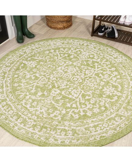 This colorful medallion rug adds rich Bohemian style to an outdoor porch or patio. Varied tones of soft green mingled with a cream pattern give this rug a hand-woven, vintage vibe. The flatweave design is great for high-traffic spaces indoors too.