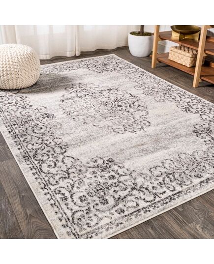 This ornate medallion rug's scrolling filigree pattern adds dreamy Bohemian cottage style to a living room, dining room, entry or bedroom. Mediterranean wrought iron is the inspiration for this design. The ivory pattern on a mingled gray background gives this rug a hand-woven, vintage vibe.