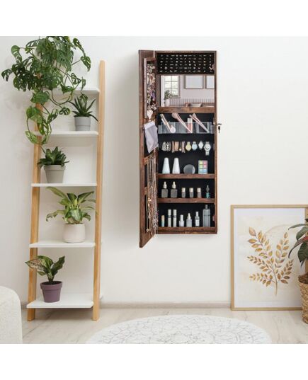 Mirrored Jewelry Armoire with Full Length Mirror and 2 Internal LED Lights-Rustic Brown