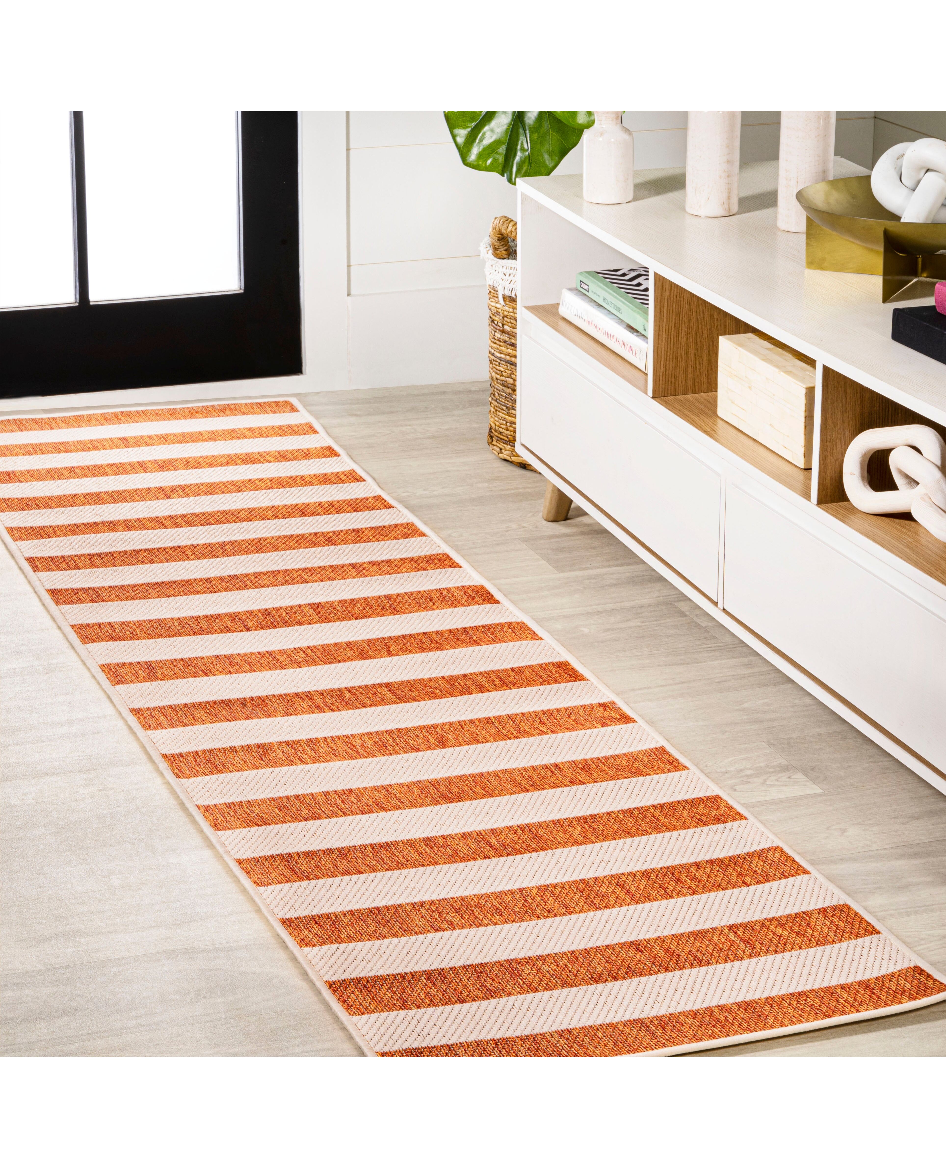 Bring home a timeless stripe rug for your modern cottage, beach bungalow or farmhouse. Our durable low pile rug features wide, woven stripes in two contrasting colors. Add graphic punch to your living room, dining room, bedroom, or porch with this easy-care, family-friendly rug.