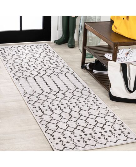 Ourika Moroccan Geometric Textured Weave Indoor/Outdoor Cream/Black Runner Rug