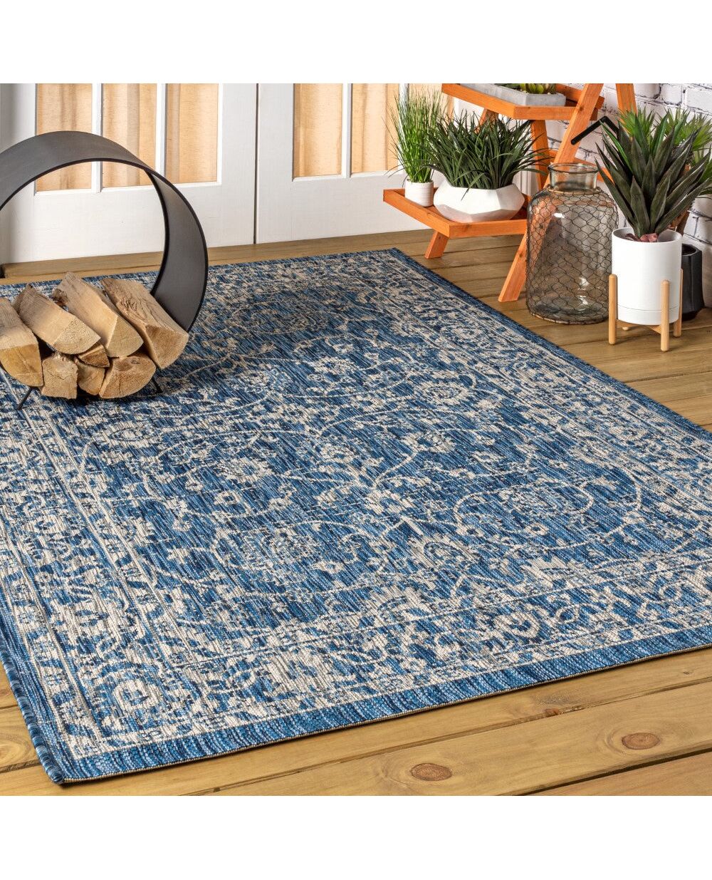With its twining vines and ornate border, this traditional pattern is an elegant addition to your outdoor porch or patio. Varied tones of deep teal and blue mingled with a light gray pattern give this rug a rich, hand-woven texture. The flatweave design is great for high-traffic spaces indoors too.