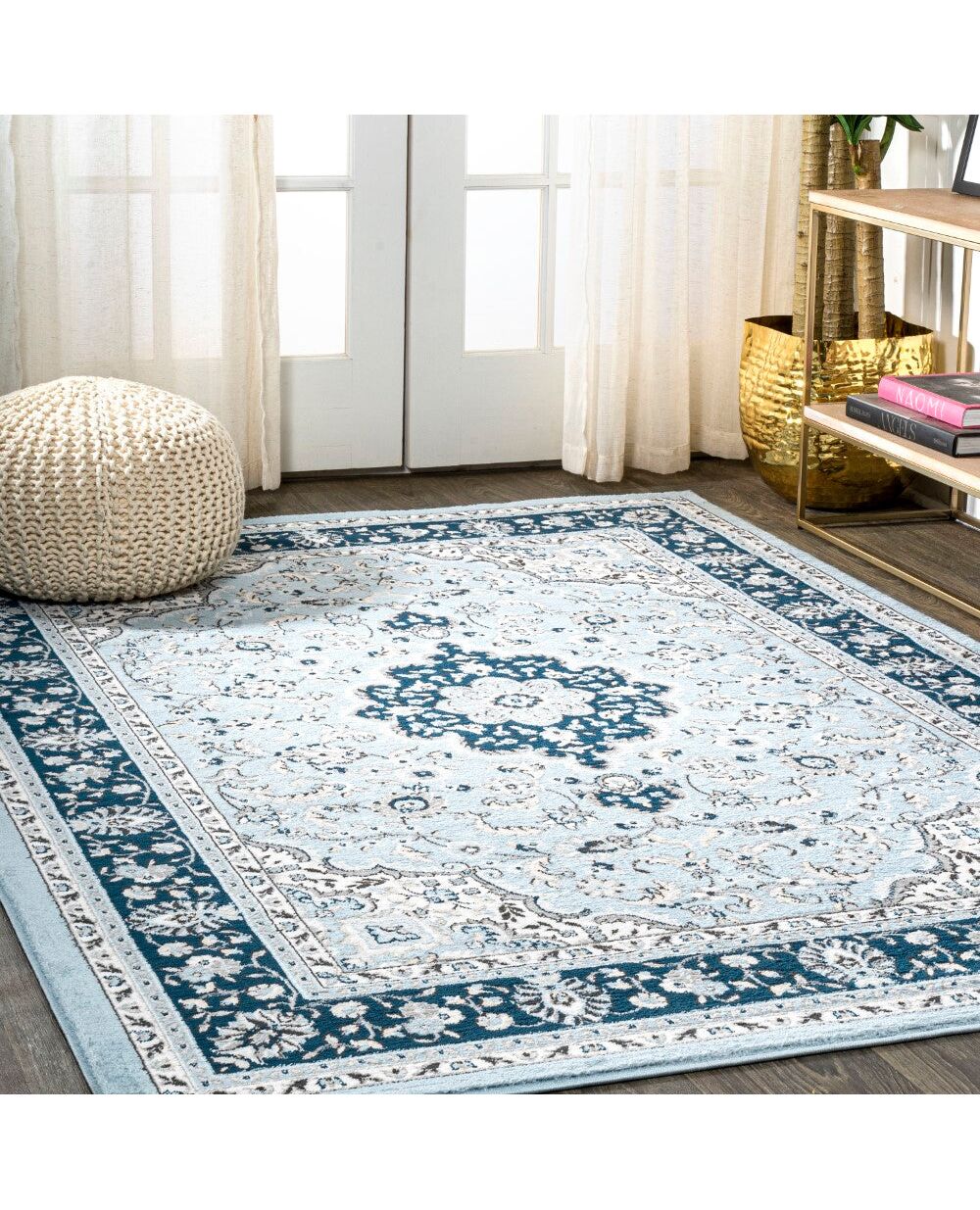 A classic medallion design gets a modern makeover in our Persian-style gray rug. The ornate pattern features a central field with traditional leaves and flowers, and a cream colored palmette border. Add a neutral touch to your living room, family room, bedroom, dining room, or home office with this durable, family-friendly rug.
