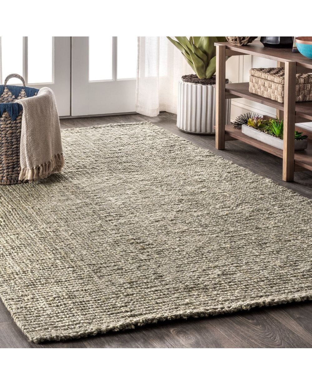 Natural jute fiber and a chunky texture make this handwoven rug a great addition to your home. The solid color works almost anywhere, in both modern or traditional rooms. This rug is reversible for longer wear.