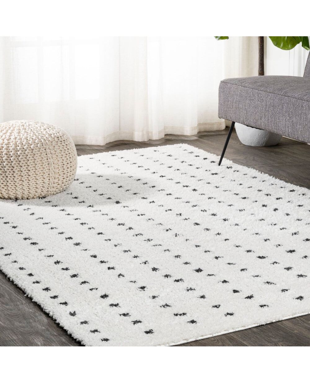 Inspired by mid-century rugs, our geometric dot rug has a soft, low shag pile. The all-over pattern is woven in black on an ivory background. Add some graphic punch to your living room, bedroom, or reading nook with this easy-care rug.