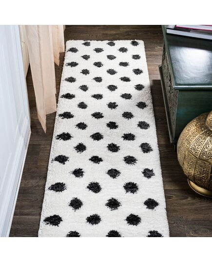 Inspired by mid-century rugs, our polka dot rug has a soft, low shag pile. The all-over pattern is woven in black on an ivory background. Add some graphic punch to your living room, bedroom, or reading nook with this easy-care rug.