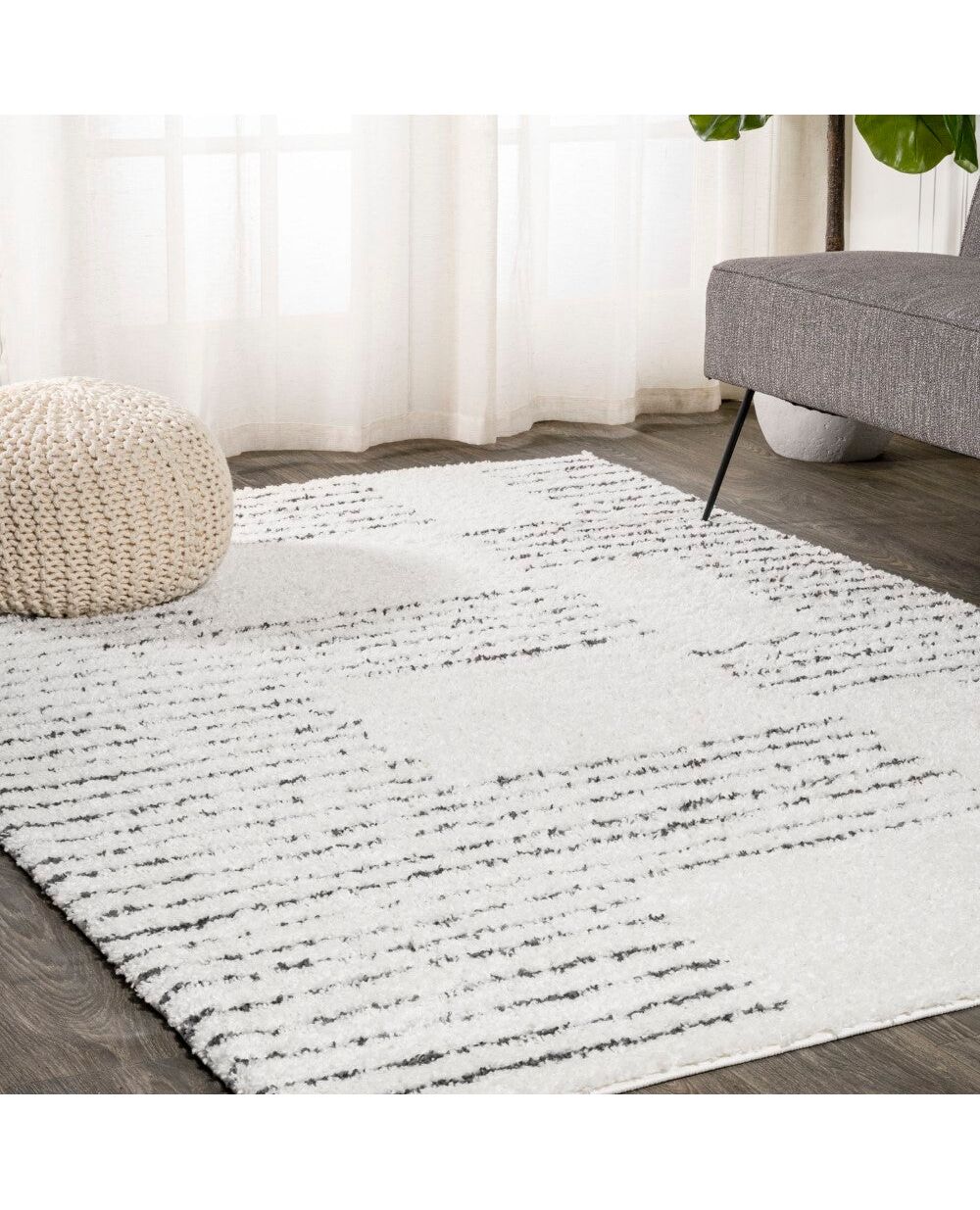 Inspired by Moroccan rugs, our modern striped rug has a soft, low shag pile. The geometric pattern is woven in black on an ivory background; our offset stripe design has mid-century flair. Add some graphic punch to your living room, bedroom, or reading nook with this easy-care rug.
