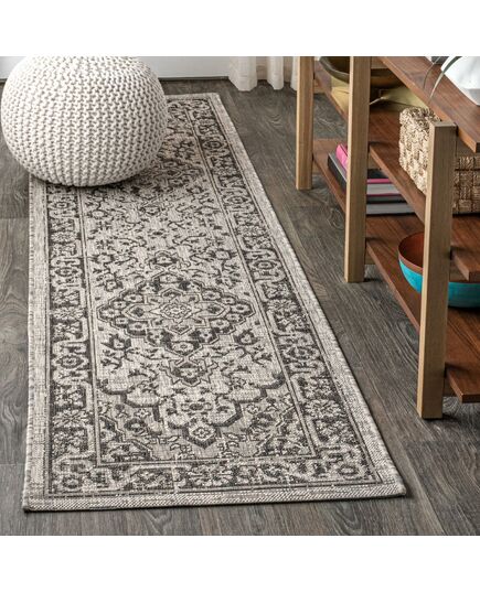 This ornate medallion rug's lively pattern adds dreamy Bohemian style to an outdoor porch or patio. Varied tones of gray mingled with a deep teal and blue pattern give this rug a hand-woven, vintage vibe. The flatweave design is great for high-traffic spaces indoors too.