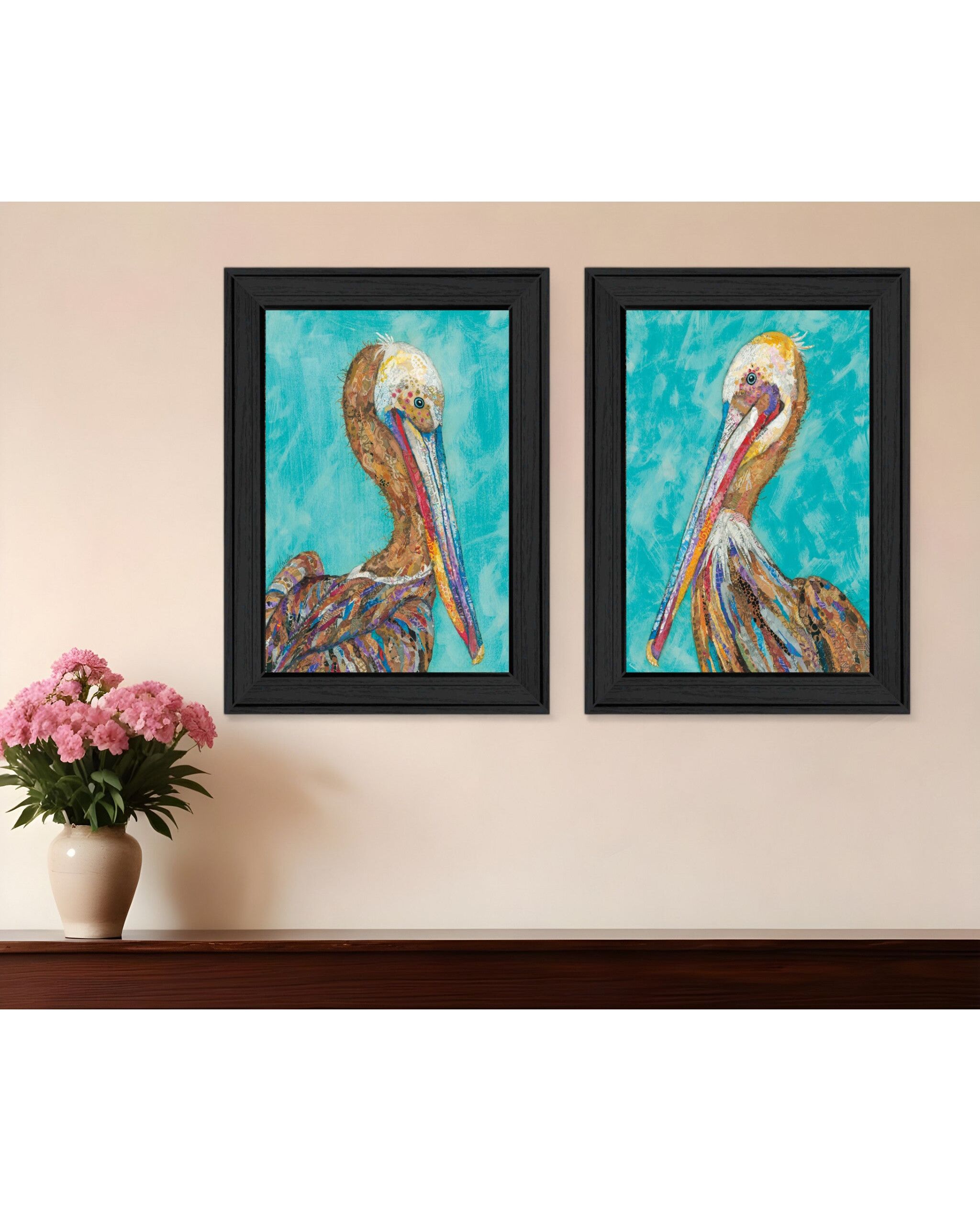 Add an air of fashion to your room and rejuvenate the space with this set of two pelicans 2 black framed print wall art. Bring a little bit of tropical sea life indoors with this good looking pelican art. This print is a visual artistic expression that allows you to decorate your space in style. Reproduced for you on paper, this hanging decorative accent will be a trendy and fashionable way to dress your walls. Hang on your wall to add some up to date fashion and decoration. Instantly liven up your space with this art that brings color and dimension to your walls. 21-inch H x 15-inch W x 1-inch D