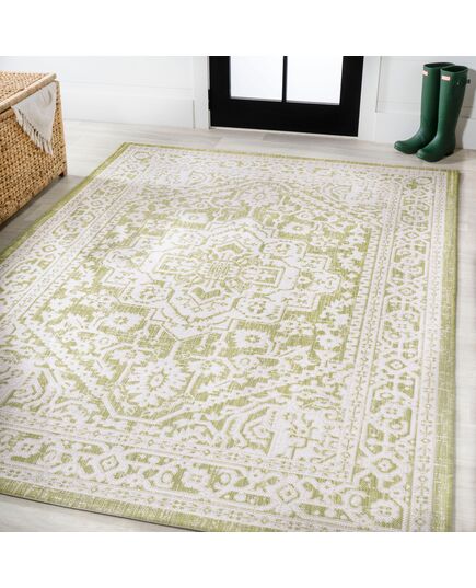 This ornate medallion rug's lively pattern adds exotic style to an outdoor porch or patio. Varied tones of soft green mingled with a cream pattern give this rug a hand-woven, vintage vibe. The flatweave design is great for high-traffic spaces indoors too.
