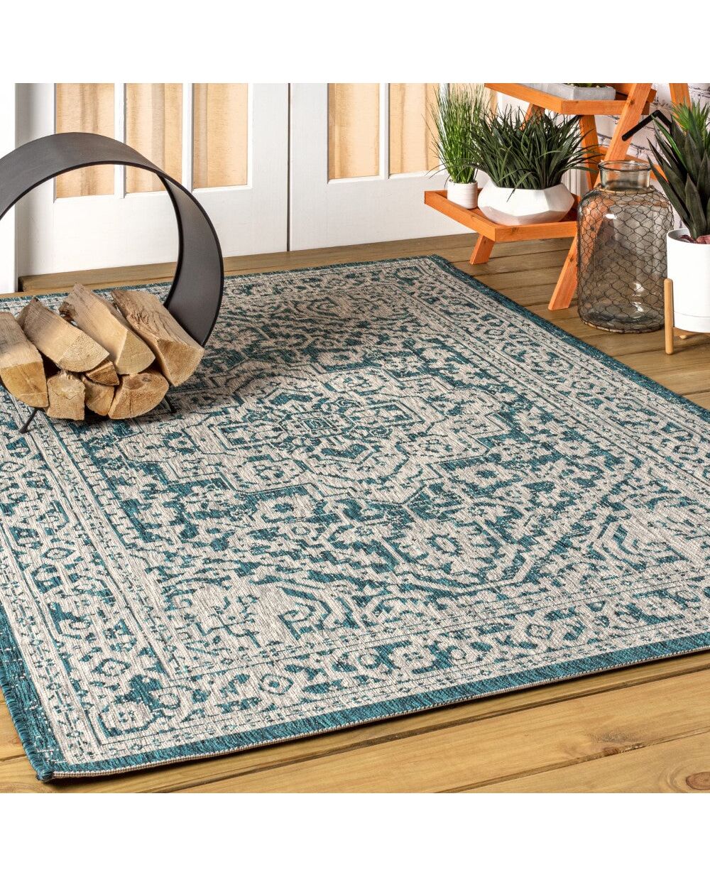 This ornate medallion rug's lively pattern adds exotic style to an outdoor porch or patio. Varied tones of soft green mingled with a cream pattern give this rug a hand-woven, vintage vibe. The flatweave design is great for high-traffic spaces indoors too.